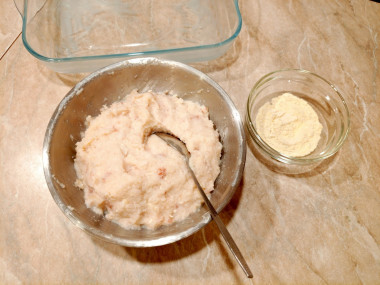 Фарш тщательно вымесите руками. Если фарш получается жидковатым, добавьте в него 1-2 ст. л. манной крупы и оставьте на 20 минут для набухания. Готовый фарш поставьте на 20 минут в холодильник.