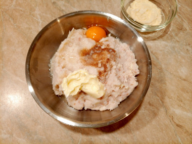 Выложите получившийся рыбный фарш в миску. Хлеб отожмите и выложите в фарш. Также добавьте яйцо, растопленное сливочное масло, соль и перец. Добавьте пропущенный через пресс зубчик чеснока.