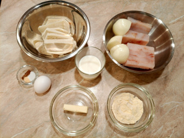 С ломтиков белого хлеба срежьте корочки. Хлеб залейте молоком и оставьте на 10 минут. Хлеб лучше брать не совсем мягкий, а вчерашний. Если у вас хлеб совсем сухой - ничего страшного, он тоже подойдет, а молоко его размочит.