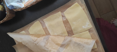Разделите тесто на несколько равных частей, из каждой сформируйте жгут. Затем жгуты раскатайте так тонко, как только получится (рабочую поверхность присыпьте мукой). Разрежьте раскатанное тесто на прямоугольники нужной величины.