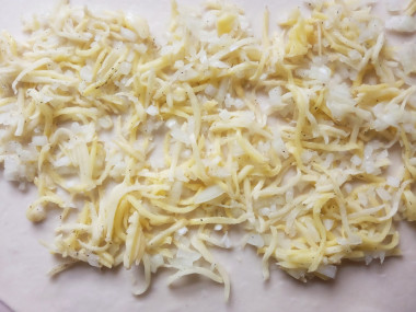 Соедините нарезанный лук с картофелем, поперчите свежемолотым черным перцем, посолите, добавьте одну ложку растительного масла и перемешайте. Начинку нужно сразу раскладывать на тесто. Медлить нельзя, иначе картошка пустит сок.