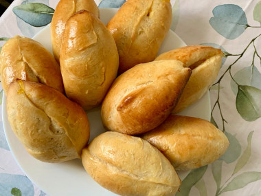 Раскатайте лепешки, слегка смазав руки, скалку и рабочую поверхность растительным маслом. Выложите начинку и сформируйте пирожки. Смажьте противень растительным маслом и выложите пирожки швом вниз. Накройте их пищевой пленкой и оставьте на 20-30 минут. Включите духовку на 180 градусов. Взбейте желток с молоком и смажьте им пирожки. Выпекайте пирожки 20-25 минут до появления красивого румянца. Точное время будет зависеть от особенностей вашей духовки.