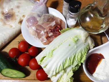 Калорийность продуктов: Куриное филе, Огурцы, Помидоры, Капуста, Майонез, Кетчуп, Лаваш тонкий, Растительное масло, Соль, Специи сухие