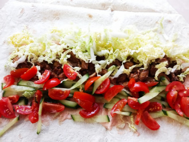Выложите обжаренное мясо, огурцы и помидоры. При желании немного присолите начинку.