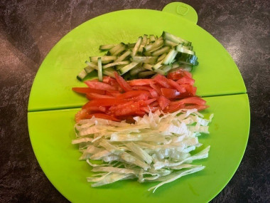 Капусту тонко нашинкуйте. Если используете белокочанную, то немного помните её руками, чтобы она стала немного мягче.