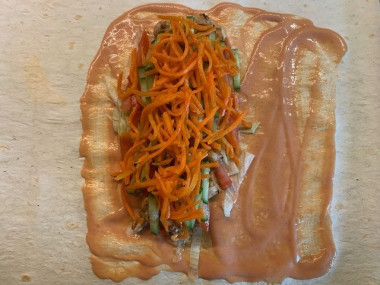 Добавила морковь по-корейски, а в соус - горчицу. Я не первый раз делаю домашнюю шаурму, но почему-то мне в голову не приходило, смешать кетчуп и майонез сразу в соус, всегда мазала по очереди. Смешать такой соус – это отличная идея! Спасибо! Также ориентируясь на фото и текст в рецепте, у меня получилось свернуть идеальную шаурму. До этого она у меня часто квадратной получалась