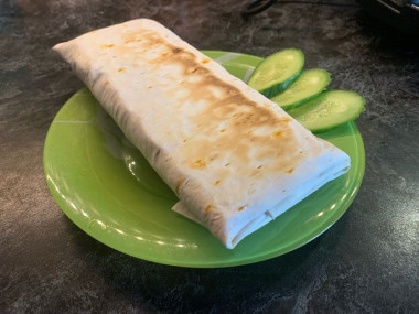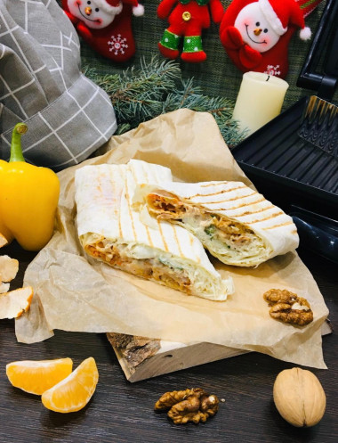 Готовую шаурму обжарьте на сухой сковороде или на гриле с двух сторон до появления румяных подпалин. Зачем обжаривать шаурму? При обжаривании лист лаваша немного подсыхает и снаружи образуется очень аппетитная хрустящая корочка, а внутри вас будет ждать сочная начинка.
