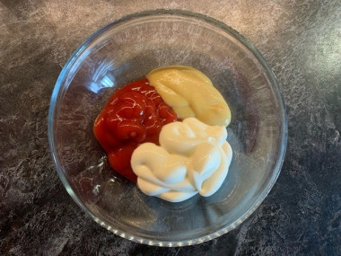 Соус смешайте заранее (майонез + кетчуп + специи).