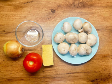 Как сделать шампиньоны с сыром и помидорами в духовке? Подготовьте необходимые продукты. Подойдут грибы, шляпка которых хорошо держит форму. Конечно, прежде всего это шампиньоны, но могут быть и некоторые сезонные лесные грибы: подосиновики, белые. Для более эстетичного вида лучше использовать грибы одинаковой величины, так что шампиньоны тут идеальны. Лесные грибы одинакового размера в таком количестве сложно найти.