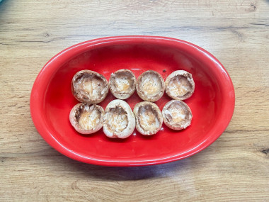Подготовьте жаропрочную форму. Выложите в нее грибные шляпки отверстиями вверх.