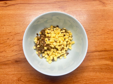 В сковороде разогрейте растительное масло. Оно может быть любым, но для жарки я рекомендую брать рафинированные сорта, - такие масла не пригорают. Добавьте лук с грибами на сковороду и обжарьте все вместе до готовности, около 5-7 минут. Немного посолите.