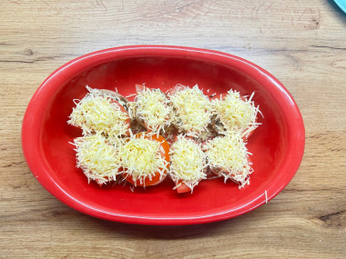 Выложите сыр сверху на помидоры. В принципе, верх закуски перед запеканием можно посыпать и натертым сыром, - наверное так даже будет красивее! Но эта мысль пришла мне в голову уже после приготовления блюда. Запекайте в заранее разогретой до 180 градусов духовке около 10-15 минут. Точное время и температуру запекания определяйте по своей духовке.