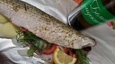 Из специй были только хмели-сунели - натерла ими внутри и снаружи, зато было белое вино. Сделала по бочкам рыбы по паре надрезов и сбрызнула вином. Пеленгас у меня был крупный, поэтому готовила подольше - минут по 15 с каждой стороны. Получилось очень вкусное нежное мясо, много сока. Беру рецепт в коллекцию!
