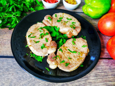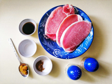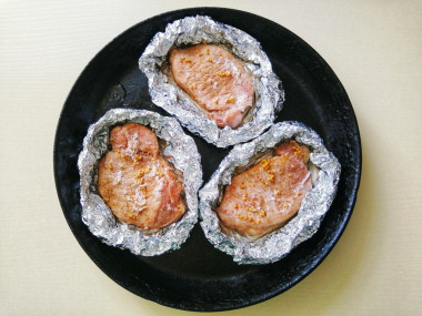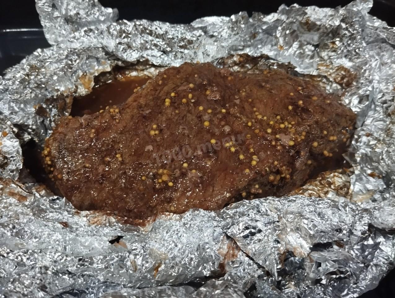 Рецепт антрекота в фольге привлек мое внимание составом маринада, в котором выдерживается мясо перед тем, как попасть в духовку. Для его приготовления взяла горчицу зернистую, соевый соус, молотый кориандр, соль, перец, сахар (вместо меда) и уксус (заменила им лимонный сок). В этой заливке мариновала мясо в течение одного часа (у меня была свинина), затем завернула каждый кусочек в фольгу и отправила в духовку.