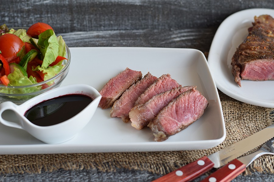 Подавайте готовый антрекот с вашим любимым соусом и украсьте при желании свежей овощной нарезкой. Мясо удобно подавать, нарезав на тонкие полоски. Приятного аппетита!