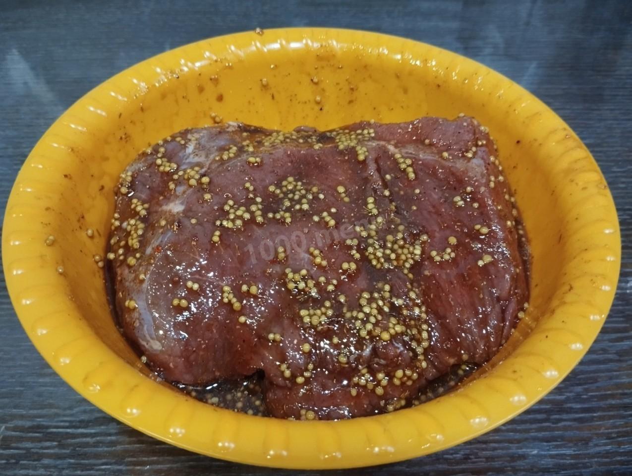 Поместите мясо в маринад. Обильно натрите куски мяса получившимся маринадом со всех сторон.