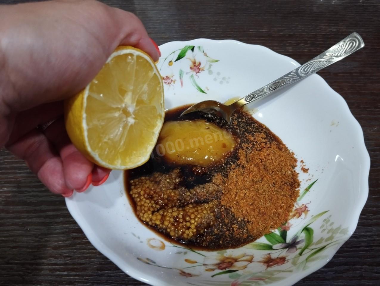 Затем сделайте маринад. Для этого в глубокой посуде соедините соль, свежемолотый чёрный перец, семена кориандра, сушёные пряности для мяса, готовую горчицу, соевый соус и мёд. Добавьте свежий лимонный сок.