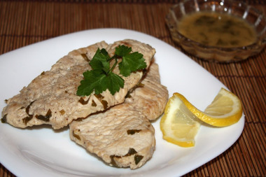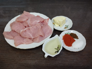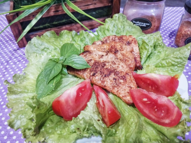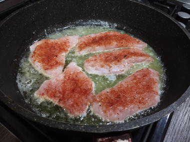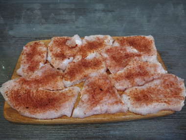 У меня было целое филе грудки индейки, которое я порезала на пластины. Посыпала солью,специями и отбила.