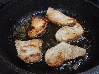 Выложите в сковороду подготовленные эскалопы и обжарьте 3-4 минуты с одной стороны.