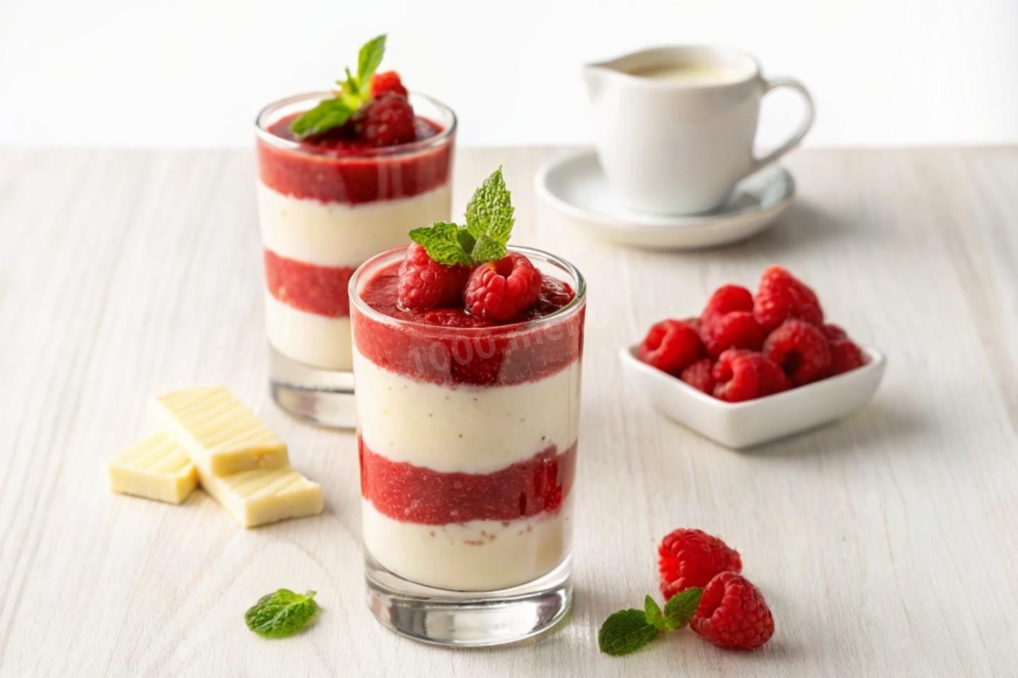 Выбираем 6 креманок, выкладываем в них половину мусса (в каждую равное количество). Затем поливаем малиновым соусом и выкладываем слой малины, после чего покрываем снова муссом, поливаем соусом, украшаем малиной и тертым белым шоколадом.