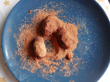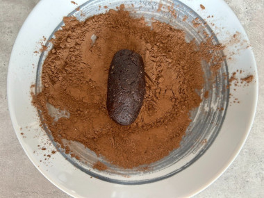 Подготовьте сахара и какао для обсыпки. Количество дано приблизительное. Какао и сахара может понадобиться больше или меньше. После обваливания пирожных у меня ещё осталась смесь какао и сахара.