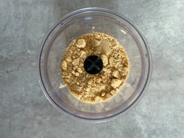 Печенье измельчите в мелкую крошку. Я воспользовалась для этого блендером, но можно сделать это по старинке. Для этого положите печенье в крепкий целлофановый пакет и раздавите его при помощи скалки.