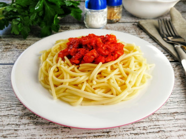 Готовые спагетти откинула на дуршлаг и выложила на тарелки. Сверху добавила соус.