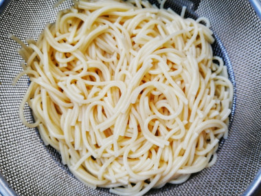 Макароны откиньте на дуршлаг и выложите на тарелку.