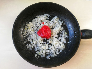 Макароны с томатной пастой сделала на гарнир к жареной курице. Первым делом поставила кастрюлю с водой для макарон на огонь, а затем занялась соусом. Лук нарезала мелким кубиком, чтобы соус получился более однородным. Зубчик чеснока натерла на терке. Обжарила овощи на растительном масле. Томатную пасту добавила, когда лук стал прозрачным.  Чтобы соус не подгорел, готовила его на маленьком огне.
