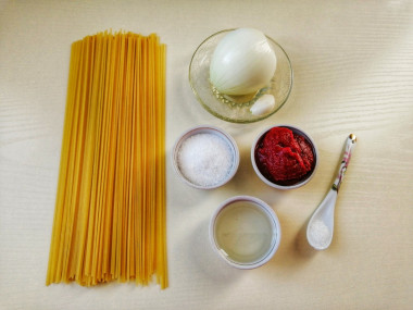 Калорийность продуктов: Макароны, Томатная паста, Лук репчатый, Чеснок, Растительное масло, Соль, Сахар