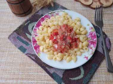 Сверху полейте макароны томатным соусом и сразу подавайте. Приятного аппетита!