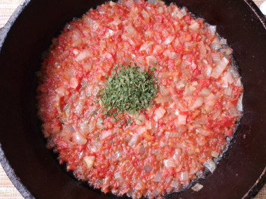 Томат брала домашний. При нарезке лука не мельчила и в почти готовую томатную массу добавила сухую зелень петрушки.