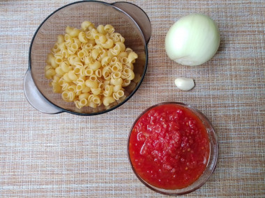 Как сделать макароны с томатной пастой? Подготовьте все необходимые продукты. Макароны берите любой желаемой формы: кому-то по душе ракушки, кому-то перья, а кто-то очень любит спагетти. Масло растительное может быть любым: и дорогим оливковым, и дешевым подсолнечным. Но поскольку масло нужно для жарки, то оно должно быть рафинированное, чтобы не пригорать на сковороде.