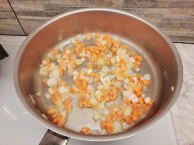 Разогрейте глубокую сковороду на среднем огне. Налейте на нее растительное масло. Выложите овощи. Жарьте их на небольшом огне в течении 5 минут, периодически размешивая лопаткой.