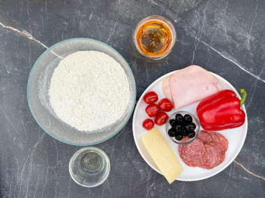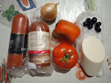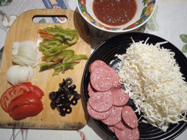 Теперь подготовьте продукты для начинки. Для соуса я взяла готовый магазинный томатный соус для пиццы. По желанию можете сделать такой соус самостоятельно: взбейте в блендере очищенные от кожицы помидоры с солью, перцем и орегано. Подходящие рецепты соусов для пиццы смотрите по ссылке в конце рецепта под шагами. Начинку можете брать любую по своему вкусу. Я сделала с ветчиной, колбасой, помидорами и болгарским перцем.