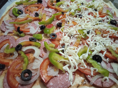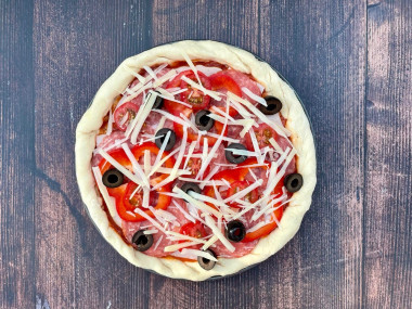 Поверх соуса распределите ветчину, колбасу, помидоры, болгарский перец и оливки.