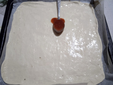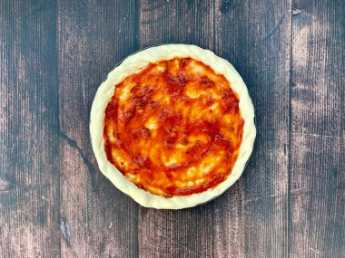 Тесто распределите по форме для пиццы (Ø 30-35 см). Или разделите тесто на две части и сделайте 2 средние круглые пиццы. Сверху смажьте тесто томатным соусом.