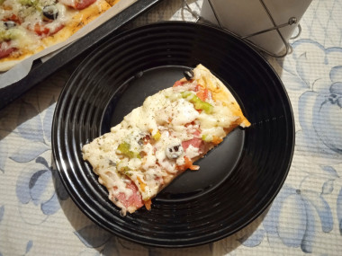 Мы очень любим пиццу, особенно готовить ее дома и экспериментировать. Тут попался мне рецепт "пицца на пиве". Как интересно, решили и мы с мужем приготовить такое чудо. Очень быстро по описанию в рецепте замесила тесто. Всё просто, только вместо воды берём пиво. Я взяла светлое. Тесто вышло ароматным, мягким и очень интересным, я бы сказала пористым. Для начинки взяли ветчину, салями, помидор, болгарский перец, лук, маслины и моцареллу. Измельчили продукты для начинки. Томатный соус сделали самостоятельно из томатной пасты. Затем раскатала я тесто на пиве, смазала соусом, разложила слоями начинку, в конце присыпала моцареллой и выпекала пиццу на пиве 12 минут в разогретой духовке. Аромат был превосходный. Получилась шикарная пицца на пиве. Она яркая, ароматная, сочная и очень аппетитная. Тесто получилось тонкое, мягкое и вкусное. Прекрасный рецепт! Обязательно ещё повторю такую пиццу и всем рекомендую! Большое спасибо автору)