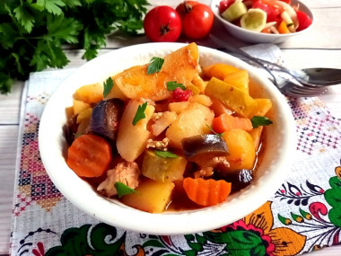 Знаю немного другой вариант блюда. Хашламу из говядины можно приготовить с помидорами, болгарским перцем, но без баклажанов.