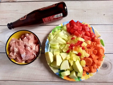 Влейте в казан стакан пива, больше жидкости не добавляйте. Пиво выбирайте светлое и вкусное. Не бойтесь, алкоголь испарится во время тушения. Останется только та пшеничная нотка, которая нужна для вкуса и аромата.