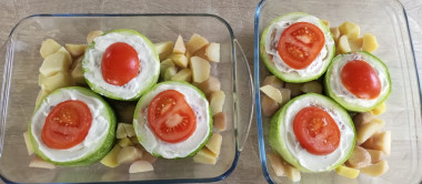 Помидоры помойте, обсушите и нарежьте кружочками. на каждый кабачок выложите по кружочку помидора.