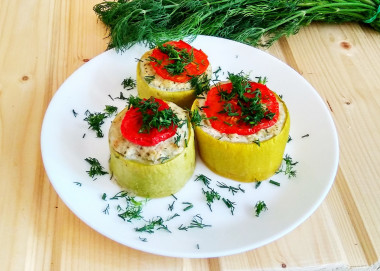 Для запекания возьмите любую жаропрочную форму - из стекла, из керамики или металлическую. Дно и бока формы смажьте немного растительным маслом и выложите подготовленные кабачки. Каждый кабачок наполните подготовленным мясным фаршем. Плотненько его прижмите.
