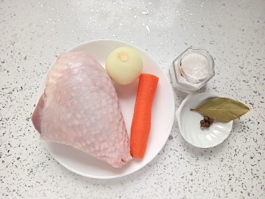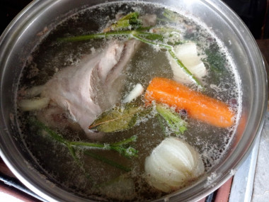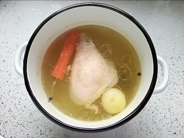 Для варки взяла небольшую голень индейки, разморозила ее и промыла. Выложила в кастрюлю вместе с луковицей и морковкой. Когда вода закипела, сняла пену. После этого добавила лавровый лист и душистый перец. Бульон варился на самом маленьком огне, буквально томился 1,5 часа. За это время жирок из голени вышел наружу образовав красивые золотистые бусинки. Лук и морковь отдали свой вкус и цвет. Специи тоже обогатили бульон ароматом и приятным привкусом.