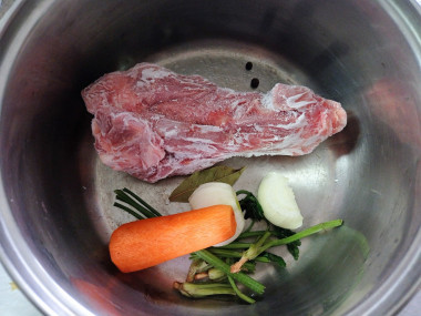 Залейте всё водой так, чтобы мясо было полностью покрыто. Поставьте кастрюлю на огонь и доведите до кипения. В процессе нагревания будет образовываться пенка, которую будет необходимо снять. Она нам не понадобится. После закипания накройте кастрюлю крышкой и сделайте маленький огонь. Оставьте бульон вариться на маленьком огне на 1-1,5часа (в зависимости от жесткости мяса).