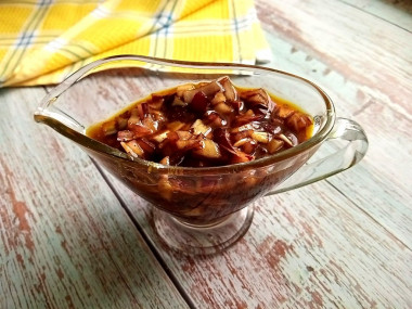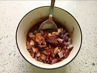 Луковицу очистите и мелко порежьте. Я использую для маринада красный лук - он чуть послаще и более мягкий по вкусу. Если у вас нет красной луковицы, можете использовать обычный репчатый лук. Также подойдет лук-шалот. Луковицу можно не нарезать, а измельчить в блендере до состояния пюре или пропустить через мясорубку. В таком случае маринад будет более вязким и ароматным.