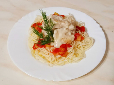 В конце жарки можете добавить в куриные грудки в сметанном соусе иголочки свежего розмарина. Подавайте блюдо горячим, само по себе или с любым гарниром. У меня это вареные макароны.