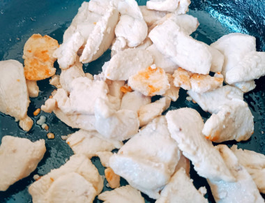 Грудку нарезала на небольшие ломтики и слегка обжарила в небольшом количестве подсолнечного масла на сковороде.