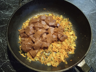 Нарезанную печень отправьте в утятницу к овощам, чуть прибавьте огонь. Перемешайте и готовьте все вместе еще минут 10.
