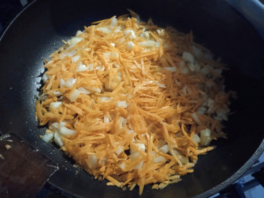 Готовить это блюдо лучше всего в казане или утятнице. Налейте в утятницу рафинированное растительное масло и выложите лук с морковью. Перемешайте и готовьте на небольшом огне в течение 10 минут.
