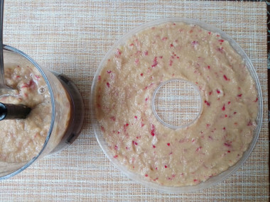 Очень тщательно смажьте формы для пастилы (или пергамент) растительным маслом. Выложите полученное пюре на каждый из поддонов и равномерно распределите массу с помощью силиконовой лопатки. Половина порции у меня поместилась на одном поддоне размером 27 на 21 см.